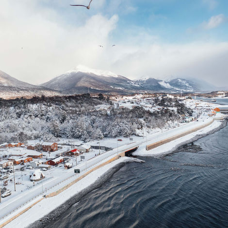 Horizonte de aguas australes: Paisaje invernal en Puerto Williams, en el fin del mundo, donde el río Ukika encuentra su desembocadura entre montañas nevadas, aves marinas y el mar austral.